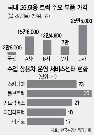 수입 상용차의 차량 결함과 관련한 소비자 불만 및 집단소송이 급증하고 있는 가운데 국내에서 판매되는 수입 상용차의 부품가격이 국산 부품에 비해 턱없이 비싸다는 소비자들의 불만이 높아지고 있다. 비싼 부품가격에 서비스 센터 등 부족한 정비 인프라도 국내 시장에서 수입 상용차의 이미지를 갉아먹고 있다는 지적이 나온다.