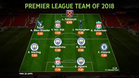 후스코어드닷컴은 1일(한국시간) 2018년 1월부터 12월까지 EPL 20경기에서 가장 높은 평가를 받은 11명을 포지션별로 발표했다.