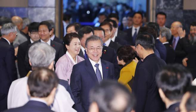 | ▲ 문재인 대통령이 2일 오전 서울 여의도 중소기업중앙회 그랜드홀에서 열린 2019 기해년 신년회에 참석하기 위해 김정숙 여사, 이낙연 국무총리, 김부겸 행정안전부 장관과 함께 입장하고 있다. |