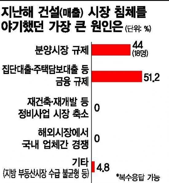 이처럼 대형 건설사 CEO들이 보수적인 경영전략을 짠 이유는 정부의 규제정책 강화로 매출의 상당부분을 차지하는 국내 주택사업의 불확실성이 커졌기 때문이다. 이번 설문조사에서도 문재인 정부의 부동산 시장 규제정책에 대한 혹평이 쏟아졌다. 특히 응답자 중 절반이 넘는 51%가 정부의 대출 규제가 건설ㆍ부동산 시장을 침체시켰다고 지적했다. 앞서 정부는 지난해 10월 모든 대출의 원리금상환액을 연소득으로 나눈 총부채원리금상환비율(DSR)을 도입하며 돈 줄을 틀어막았다. 이와관련 건설사 CEO 중 절반인 50%는 '다중규제의 확대 도입은 적절하지 않다'고 답했다. 정부가 소득에 비해 빚이 많은 사람을 걸러내기 위해 취한 조치였지만, 신 총부채상환비율(DTI)을 도입한 상태에서 더해진 과도한 규제라는 게 시장의 판단이었던 셈이다. 같은 논리로 건설사 CEO 중 60%는 금융당국이 주택담보대출을 가계부채 증가의 주범으로 보고 있는 시각에 대해 '부적절하다'고 말했다.