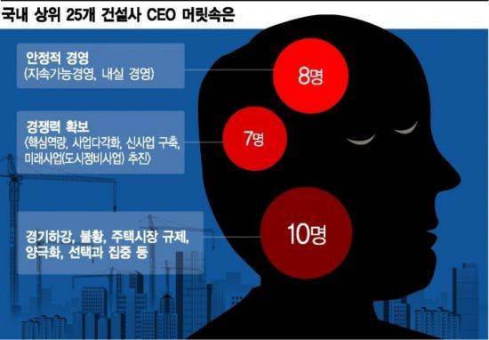 '지속가능경영'을 비롯한 '안정적 수주 물량' 확보와 '현금 흐름의 안정성', '안정적 회사 운영', '현상 유지' 등 유난히 '안정'이라는 표현이 눈에 띄었다. 올해 글로벌 경제는 물론 국내 경기상황도 악화될 것으로 전망되자 건설사 CEO 역시 '시장 다운턴(경기하강)'이나 '불황' 등을 올해 핵심 키워드로 꼽고, 급변하는 경영 환경에 대응할 수 있는 경쟁력 확보에 초점을 맞추고 있는 것이다. '차별적인 핵심 역량 강화'나 '사업 다각화', '신사업 기반 확충', '불황에 대비한 경영 전략' 등의 답변도 경영 악화에 대비한 자구책을 마련하지 않으면 살아남을 수 없다는 절박함이 담긴 표현으로 풀이된다.