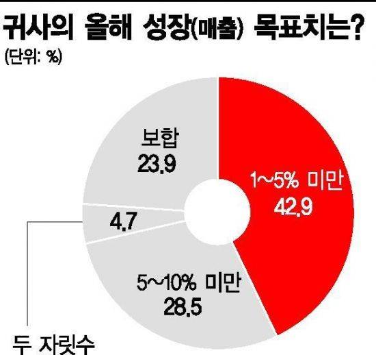 3일 아시아경제가 국내 상위 25개 건설사 CEO를 대상으로 한 설문에서 응답자 중 절반이 넘는 67%가 올해 5% 미만의 성장을 목표로 하고 있다고 답했다. 세부적으로는 1~5% 미만의 매출 성장이 43%로 가장 많았고 전년 수준이라는 응답도 24%나 나왔다. 반면 이보다 높은 '5~10% 미만'은 29%였고 두 자릿수 성장을 기대한다는 응답은 4%에 그쳤다.