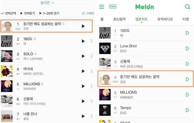 | ▲ 지난 1일 새벽 조빈의 '듣기만 해도 성공하는 음악'이 주요 음원사이트 상위권에 올라섰다. |