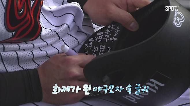 그는 "시즌을 치르면서 그때그때 즉흥적으로 써놓는다. 그런데 좋았을 때의 기억들을 꺼내기가 쉽지 않더라. 헬멧 안의 메모를 보면서 '아 내가 좋았을 때 이런 식으로 준비했고, 이런 식으로 타격을 했구나' 라고 생각한다. 그렇게 훈련하면 슬럼프를 빨리 탈출하는데 상당히 큰 효과가 있다. 헬멧은 나하고 365일 거의 붙어 있지 않나. 가장 보기 쉬운 곳에 글을 써놓다 보니까 그렇게 된 거다"라고 설명했다.