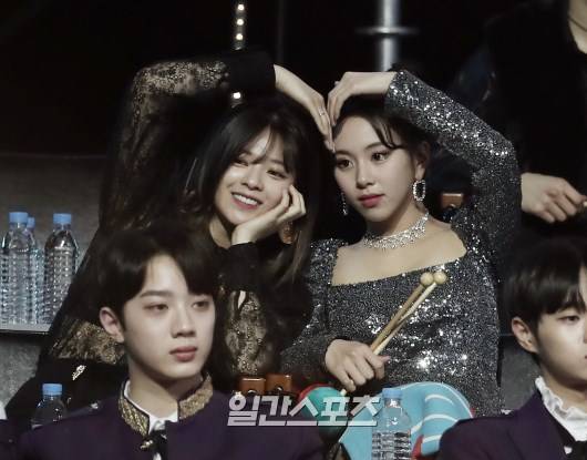제33회 골든디스크어워즈 음반 부문 시상식이 6일 오후 서울 고척스카이돔에서 화려하게 개최됐다. 트와이스 정연과 채영이 대기석에서 팬들을 향해 하트를 그려보이고 있다.