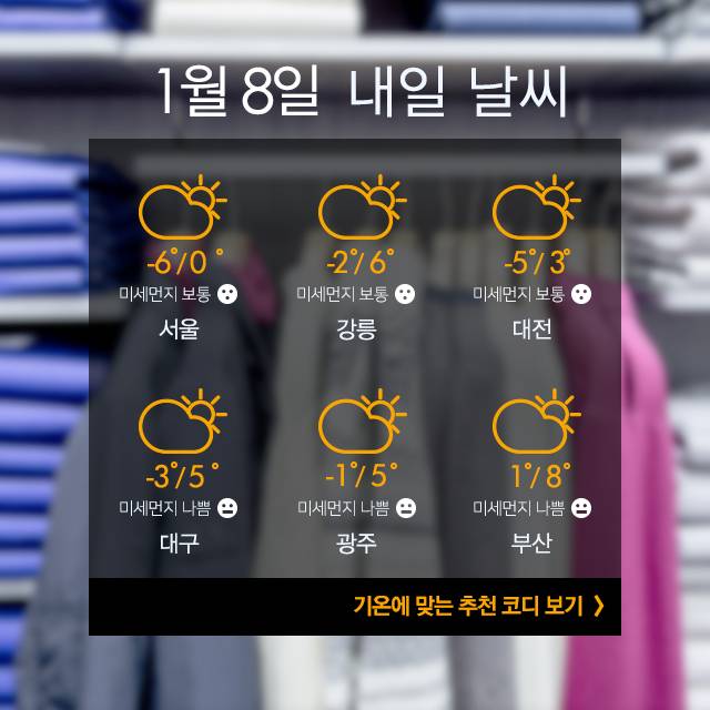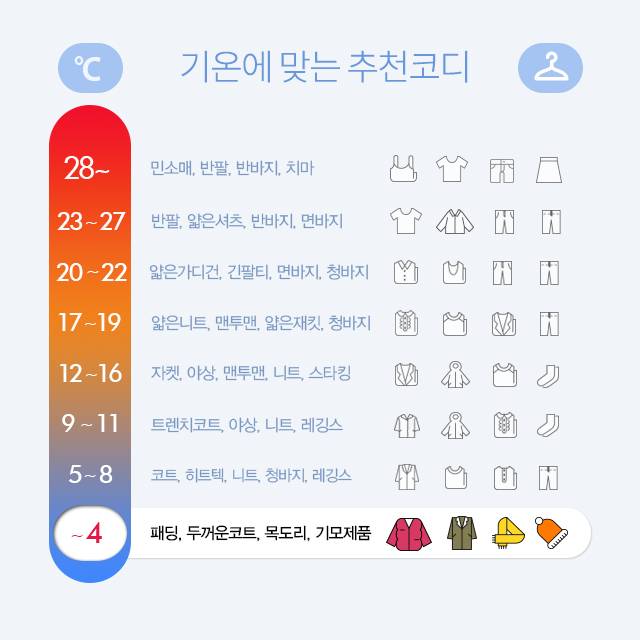 날씨에 맞는 추천 코디는흰 패딩이다. 방송인 문가비는 허리를 덮는 흰색 패딩 안에 블랙 티셔츠와 바지를 입고 '블랙 앤 화이트' 패션을 선보였다. 그룹 뉴이스트의 백호는 화이트 롱 패딩 안에 스트라이프 티셔츠를 함께 입어 발랄한 겨울룩을 완성했다.