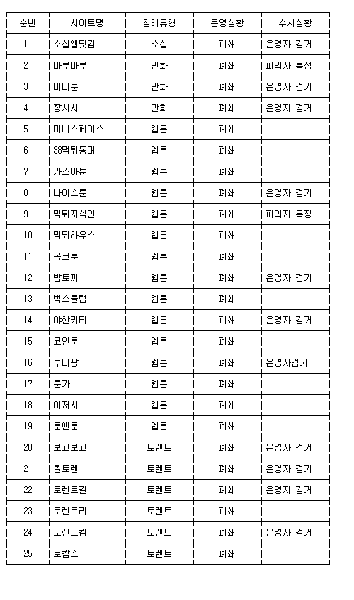이를 통해 작년 한 해 동안 마루마루를 포함해 25개 사이트를 폐쇄하고 그중 13개 사이트 운영자를 검거했다.