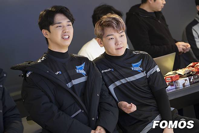 8일 오후 종로구 롤파크에서 2019 리그오브레전드 챔피언스(롤챔스) 스프링 프로필 촬영이 진행 중이다. 아프리카 프릭스 '젤리' 손호경(왼쪽)과 '스피릿' 이다윤이 동료들의 촬영 모습을 바라보고 있다.