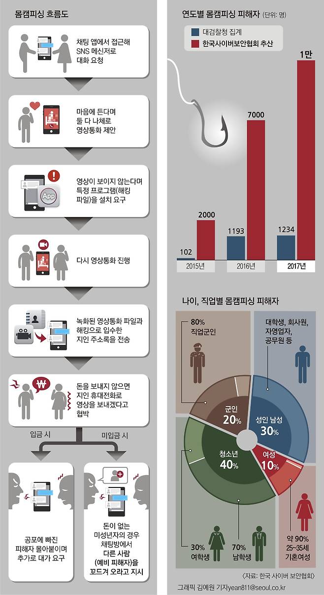 하지만 수사기관이 파악하고 있는 몸캠피싱 피해는 실제의 10분의1 수준에 불과하다. 대검찰청 통계를 보면 2017년 몸캠피싱은 1234건 발생한 것으로 집계됐다. 대다수 피해자가 수사기관에 신고조차 못한 것이다.