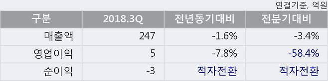 - 2018.3Q, 매출액 247억(-1.6%), 영업이익 5억(-7.8%)