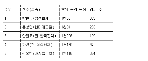 ◇ 남자프로배구 개인 통산 후위 공격 순위(11일 현재)