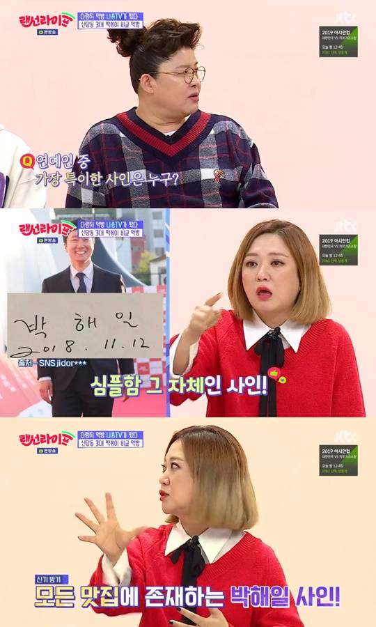 MC 이영자는 “연예인 중에 사인을 가장 특이하게 하는 사람이 누구인가?”라고 물었다. 김숙은 “박해일”이라고 답했다. 실제로 박해일은 본인 이름을 정직하게 쓰는 사인으로 유명하다.