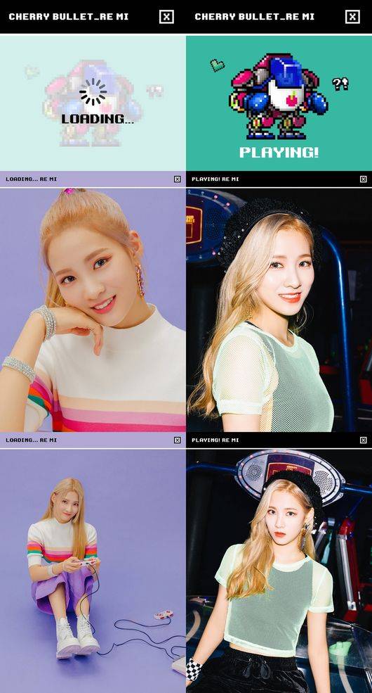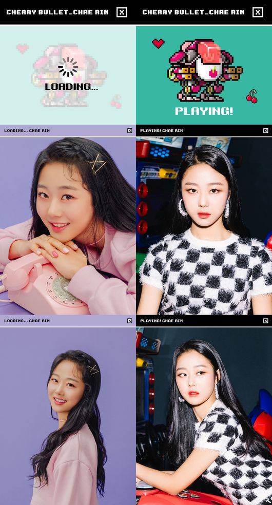 재킷은 사랑스러운 매력이 돋보이는 로딩(LOADING) 버전과 에너제틱한 플레잉(PLAYING) 버전, 그리고 개인 아이템이 장착된 로봇 이미지도 선보였다. 채린과 레미는 각각 분홍색 배경에서 빈티지한 분홍 전화기와 팩 게임기 소품으로 사랑스러움을 더했으며, 게임 아케이드를 배경에선 개성이 드러나는 착장을 한 채 확연히 다른 반전 매력을 선보였다.