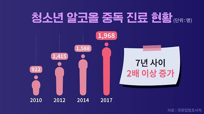 국회입법조사처의 '청소년 음주 규제의 문제점 및 개선방향' 보고서에 따르면, 청소년 알코올 중독 환자는 2010년 922명에서 꾸준히 증가해 지난해 1천968명으로, 2천 명에 육박했습니다. 최근 7년 사이 2배 이상 증가한 겁니다.