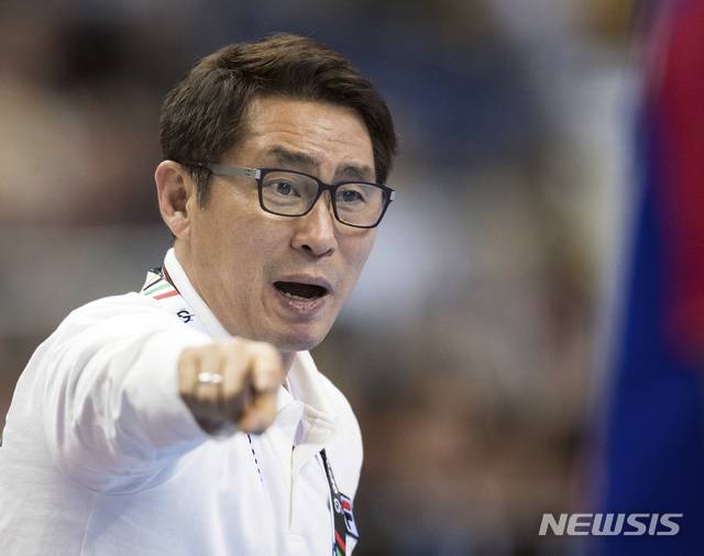 【베를린=AP/뉴시스】조영신 감독이 12일(현지시간) 독일 베를린의 메르세데스 벤츠 아레나에서 열린 제26회 세계남자핸드볼선수권대회 조별 리그 A조 2차전에서 러시아와 경기 중 작전 지시를 하고 있다.