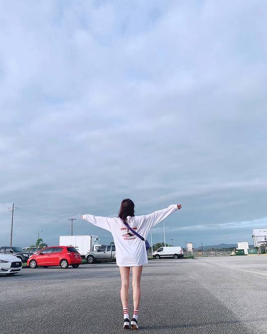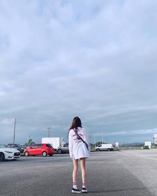 공개된 사진 속 한보름은 괌에서 허벅지까지 내려오는 맨투맨 티셔츠를 입고 포즈를 취하고 있다.