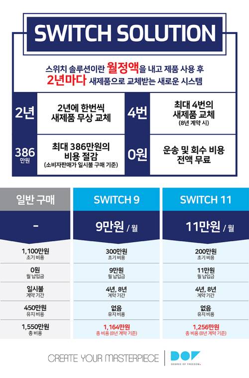 스위치 솔루션은 월정액을 내고 제품을 사용 후, 2년에 한번 새제품으로 교체 받는 새로운 시스템이다. 초기비용 300만원과 9만원대의 월 이용료를 납부하는 ‘스위치 9’, 초기비용 200만원에 월 이용료 11만원을 납부하는 ‘스위치 11’ 두 가지 옵션으로 선택이 가능하다.