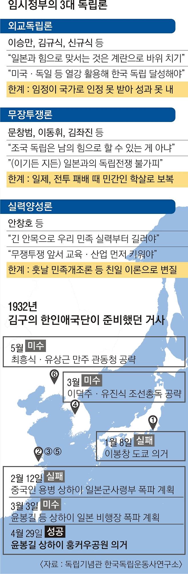 김구는 한인애국단을 조직해 5개월간 6건의 암살, 폭파를 기획했다. 대부분 실패하거나 미수에 그쳤다. 그럼에도 1932년 1월 이봉창(1900~1932)이 도쿄에서 일왕 히로히토(1901~1989)에게 수류탄을 던져 한국인들의 저항의식을 전 세계에 알린 것은 고무적이었다.