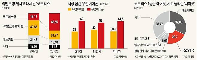 다나와에 따르면 코드리스 이어폰은 지난해 무선이어폰 판매량의 48.55%를 차지했다. 2017년(19.17%) 대비 두 배 이상 높아졌다. 코드리스 이어폰은 선이 없고 수납하기 간편해 인기가 많다. 수년간 무선이어폰 시장의 대세였던 ‘넥밴드(목걸이)’ 이어폰은 같은 기간 점유율이 42.83%에서 24.77%로 뚝 떨어졌다.