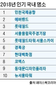 전국 테마파크와 쇼핑몰 등 시설 중에선 에버랜드가 최고 인기 명소에 올랐다. 명소 10곳에 이름을 올린 인천공항과 서울올림픽 주경기장이 공공시설임을 감안하면 에버랜드가 실질적인 1위를 차지했다. 롯데월드와 롯데월드타워 서울스카이, 경복궁, 현대백화점, 코엑스, 동대문디자인플라자, N서울타워 등이 뒤를 이었다.