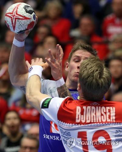 epa07307172 Sweden's Linus Arnesson (L) in action against Norway's Kristian Bjornsen (R) during the IHF Men's Handball World Championship match between Sweden and Norway in Herning, Denmark, 21 January 2019. EPA/SRDJAN SUKI