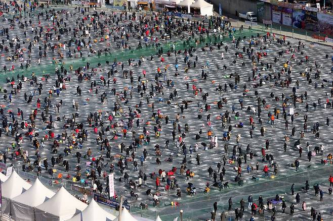| ▲ '2019 화천 산천어축제'가 개막 3주째로 접어든 20일 오후 강원 화천군 화천천 축제장이 얼음낚시를 즐기는 관광객들로 가득 차 있다. 산천어축제는 오는 27일까지 열린다. 2019.1.20 |