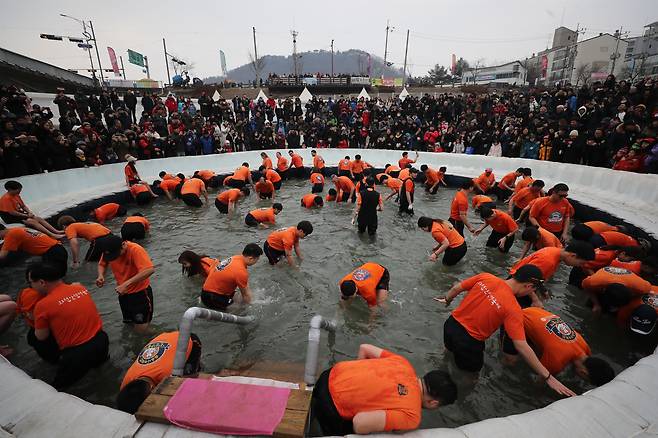 | ▲ '2019 화천 산천어축제' 개막 3주째 주말을 맞은 19일 강원 화천군 화천천 맨손잡기 체험에 나선 관광객이 겨울추억을 만들고 있다. 2019.1.19 |