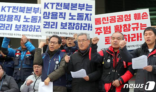 (전주=뉴스1) 문요한 기자 = 민주노총전북본부 등 22개 전북지역 시민사회 단체 및 정당 회원들이 23일 전북 전주시 KT 전북본부 앞에서 '통신공공성 훼손 황창규 KT 회장 퇴진 및 KT 노동인권 보장 촉구' 기자회견을 하고 있다. 이들은 KT아현국사 통신구 화재, 정치권 불법 후원 등을 문제삼으며 황창규 회장 퇴진을 주장했고, 또 통신선로 설치·유지보수 업무의 하청서비스로 저하된 통신공공성 회복, 통신망 관리직 상용직 노동자들의 정당한 대우를 촉구했다.2019.1.23/뉴스1