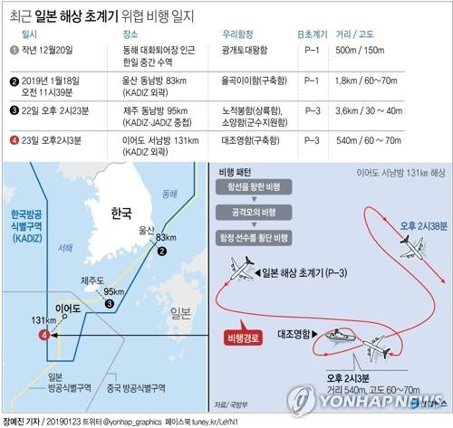 ![일본 초계기, 23일 우리 함정 향해 또 근접비행 (서울=연합뉴스) 국방부가 23일 오후 일본 해상자위대 초계기가 이날 우리 해군 함정을 향해 근접 비행을 했다고 밝혔다. 사진은 국방부가 지난 4일 공개한 지난해 12월 20일 조난 선박 구조작전 중인 광개토대왕함 상공에 저고도로 진입한 일본 초계기 모습(노란 원). [국방부 유튜브 캡처] photo@yna.co.kr](https://img4.daumcdn.net/thumb/R658x0.q70/?fname=https://t1.daumcdn.net/news/201901/23/yonhap/20190123194117369cdmj.jpg)