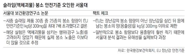 어린이는 물론이고 성인들 사이에 큰 인기를 끌고 있는 슬라임(액체괴물)에서 유럽연합(EU) 기준치의 최대 7배에 달하는 독성물질이 검출됐다고 밝혀 슬라임 불매 운동에 큰 영향을 준 서울대 논문의 분석 결과가 실제보다 과장된 것으로 드러났다. EU 기준은 슬라임을 삼켰을 때 몸에 남는 붕소의 양(예상 섭취량)에 대한 기준치인데 연구진이 슬라임 속에 든 붕소 전체의 양(함량)을 기준으로 삼은 결과다. 국책 연구비를 써 얻은 연구 결과가 오히려 국민에게 혼란만 준 셈이다.