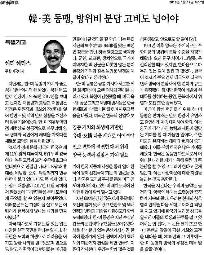 10억 달러의 방위비 분담을 한국 정부에 요구한 뒤인 지난 1월 17일, 해리 해리스 주한미국대사가 <조선일보>에 특별기고문을 실었다. '한미 동맹, 방위비 분담 고비도 넘어야'라는 제목의 기고문에서 해리스 대사는 "21세기 경제문화 강국인 한국은 세계 11위 경제대국이자 6위 무역강국이다"라며 한국의 경제력을 높이 평가한 뒤 이렇게 말했다.