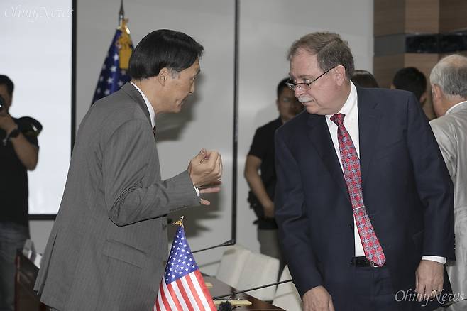 | ▲ 이야기 나누는 한-미 방위비협상 대사 지난 2018년 6월 26일 오전 서울 서초구 국립외교원에서 열린 한미방위비협상 제4차 회의에서 장원삼 우리측 한미방위비협상대사와 미국 측 티모시 베츠(Timothy Betts) 한미방위비협상대사가 회의 시작 전 이야기를 나누고 있다. |