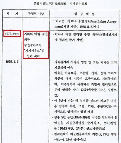 한국은 종전에 내지 않았던 분담금을 1991년부터 부담하고 있다. 이에 비해 필리핀은 그보다 훨씬 전에 기지 사용료를 받은 적이 있을 뿐만 아니라, 더 나아가 군사 지원까지 얻어낸 바 있다. 송영선 논문에 아래와 같은 대목이 있다. 아래의 FMS(Foreign Military Sales)는 '대외군사판매'란 의미로, 미국이 동맹국이나 우방에 대한 안보 지원 차원에서 무기를 판매하는 제도다.