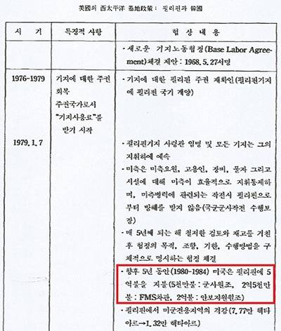 "향후 5년(1980~1984) 동안 미국은 필리핀에 5억불을 지불(5천만 불: 군사원조, 2억 5천만 불: FMS 차관, 2억 불: 안보지원 원조)"