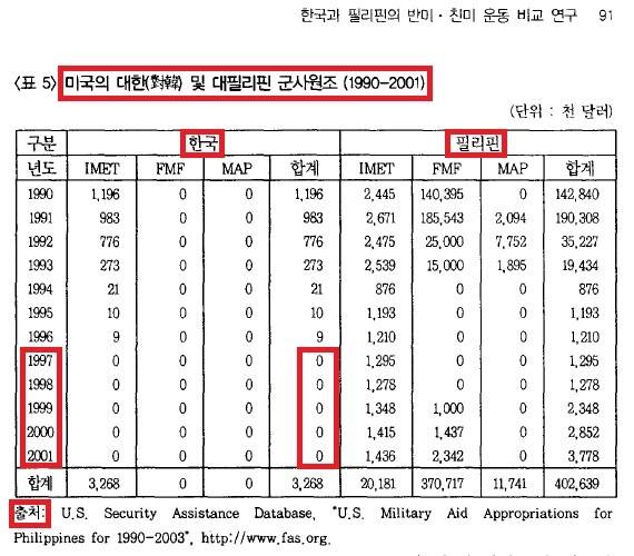 미국의 대한(對韓) 군사원조는 한국이 방위비를 분담하기 시작한 지 6년 뒤인 1997년에는 0원으로 떨어졌다. 반면, 필리핀은 과거 기지 사용료를 받은 적이 있을 뿐만 아니라 미군이 기지를 반환하고 철수한 1992년 이후에도 계속해서 군사원조를 받았다. 무상군사원조(MAP)는 1993년까지 받았고, 해외군사차관(FMF)은 1994년에 끊어졌다가 1999년부터 다시 받았다. 국제군사교육 및 훈련 제공 프로그램(IMET)은 그 후로도 계속 받았다. 한국과 너무나 비교되는 장면이다.