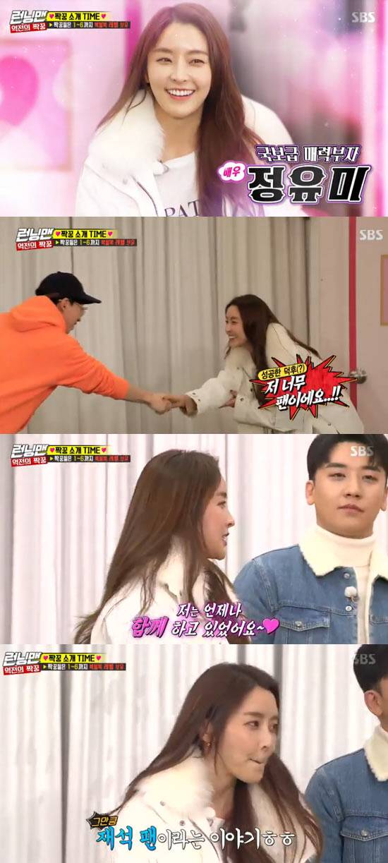 첫 '런닝맨' 출연인 정유미는 등장하자마자 악수를 청하는 유재석을 보고 수줍은 소녀 모드로 변모했다. 오랜 광팬임을 고백한 정유미는 "브래드피트 결혼 이후로 유재석 결혼식 날 펑펑 울었다"며 성공한 덕후의 면모를 드러냈다. 5년 만에 '런닝맨'을 다시 찾은 '귀여운 악녀' 이유리는 명불허전 불꽃열정으로 멤버들을 긴장케 했다.