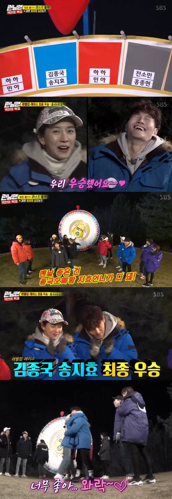 반전은 가장 마지막에 일어났다. 김종국 송지효 커플이 적은 이름표를 붙이고도 우승을 차지했다. 룰렛의 화살표가 그 사이에 붙은 두 사람의 표식인 파란색에 멈추자 모두가 놀랐다.