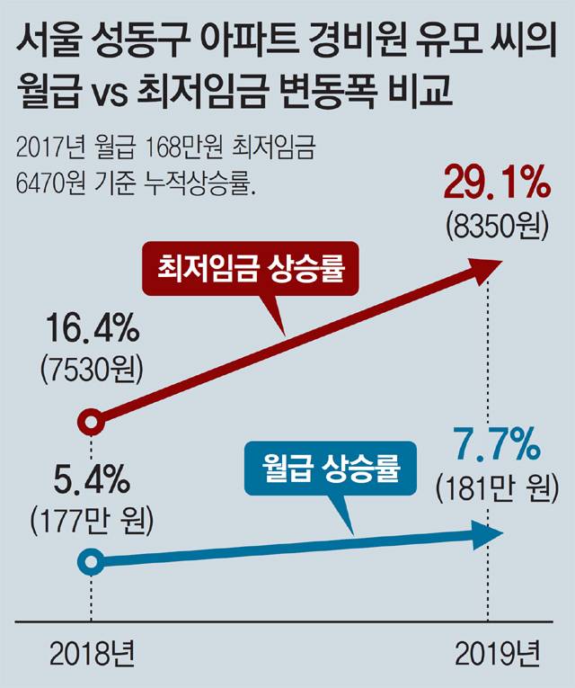 18일 서울 성동구의 한 아파트에서 만난 경비원 유모 씨(73)는 혹여나 일자리를 잃게 될까 걱정하고 있었다. 최저임금 문제 때문이다. 유 씨는 이 아파트에서 2016년 1월부터 경비원으로 일하고 있다. 그사이 최저임금은 2017년 대비 올해 29.1% 올랐다.