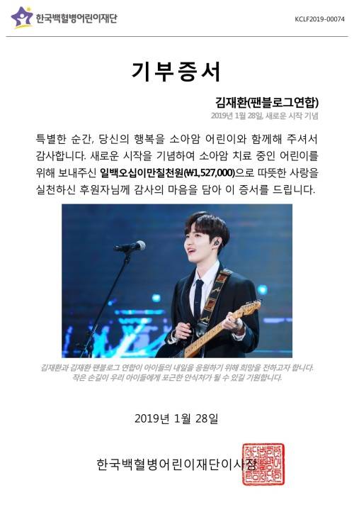 김재환 팬블로그연합은 “어릴 때부터 꿈을 포기하지 않고 도전하여 가수가 됐듯이 우리 아이들도 꿈을 포기하지 않고 희망을 가지길 바라는 의미에서 기부했다”며 “김재환의 2019년 홀로서기 새 출발을 응원하는 마음을 담았다”고 밝혔다.
