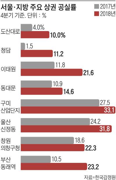 2017년 1분기 9.5%이던 공실률(이하 100평 이상 중·대형 상가 기준)이 작년 1분기엔 10.4%로 올랐고, 4분기엔 10.8%로 2013년 이후 최고치를 찍었다.