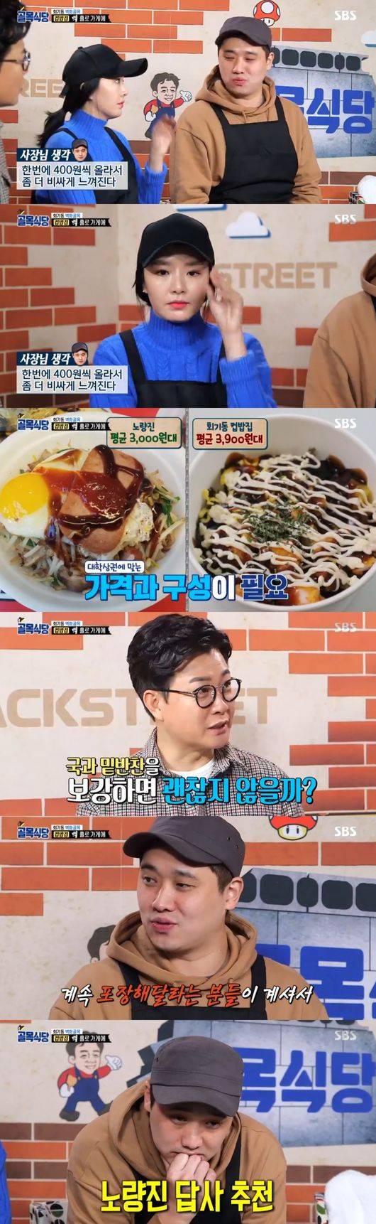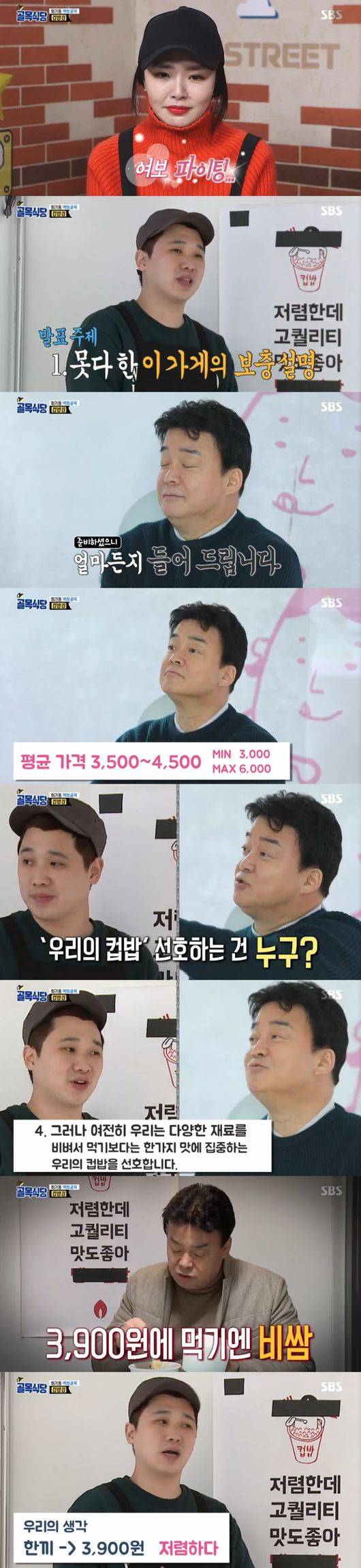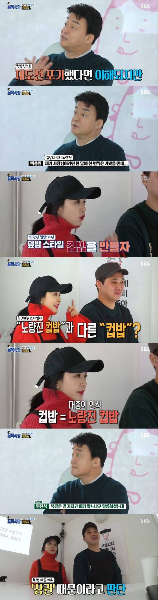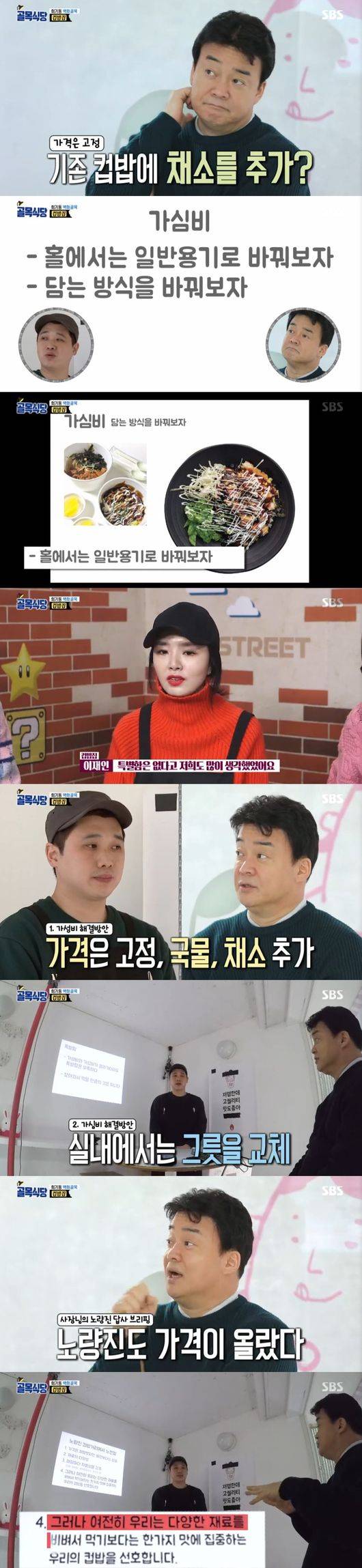 이에 백종원은 "대중의 인식은 노량진 컵밥"이라면서 "컵밥을 준비하려면 아무리 다른 컵밥이어도 주류 컵밥 연구를 했어야했다, 비교대상인 노량진 구성, 삼겹살과 떡갈비, 스팸, 알맹이 있는 재료가 3개나 들어갔지만 여기는 1개, 그리고 가격이 비싸, 채소가 싸니까 올리겠다는거 아니냐"며 "대중이 아닌 사장님들 눈높이로만 보고있다"고 일침했다.