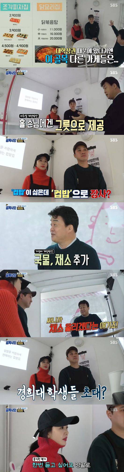 백종원은 이날 컵밥집을 찾아갔다. 직화제육 덮밥부터 치킨마요 덮밥을 주문, 컵밥집 사장들은 상황실로 이동했다. 부부인 두 사람은 회기동 컵밥 장사만 2년 2개월차라고 했다. 먼저 남양주에서 장사를 시작했으나 힘들었던 과거를 털고 이쪽으로 이동했다고 전했다.