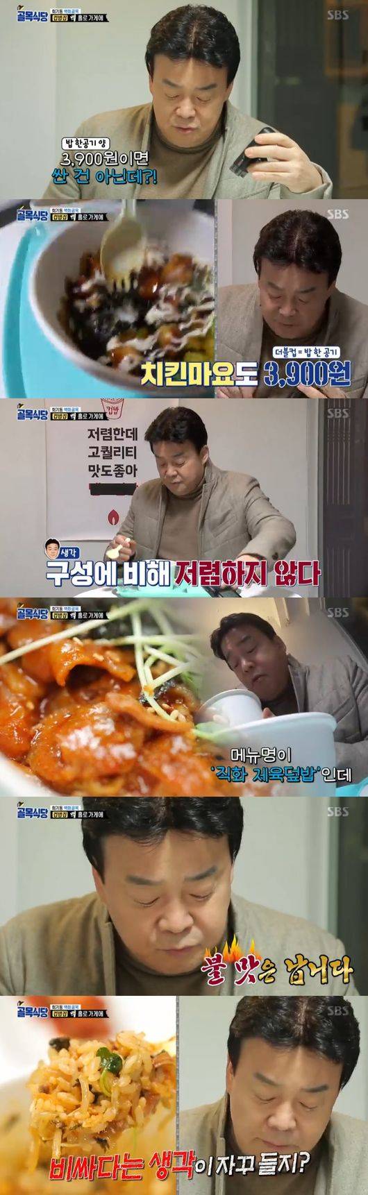 백종원은 식당에서 컵밥을 시식했다. 노량진 대표음식인 컵밥을 떠올리며 가격 3천9백원에 대해 "저렴한 편은 아니다"고 했다.보통 노량진 컵밥은 평균 3천원 구성으로 알려졌다. 백종원은 "구성에 비해 저렴하진 않지만, 맛이 중요하다"며 시식했다. 경쟁력에 대해 컵밥집 사장도 맛을 자부한 상황이었다. 이어 숨죽이며 평가를 기다렸다. 백종원은 직화제육 덮밥에 대해 "불맛은 난다"고 입을 열면서 "애매하다"고 했다. 그러면서 "비싸단 생각이 든다"고 했다. 사장은 물가상승에 맞춰 가격을 4백원씩 인상했다고 말했다. 인상할 때도 많이 고민했던 사항이라고 전했다.