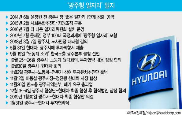 ▶극적 합의…성공모델 첫발= 광주형 일자리는 기업이 낮은 임금 수준의 공장을 만들고 지자체가 기반시설과 복리/후생 비용을 지원하는 일자리 창출 프로젝트다. 광주시가 투자자와 합작법인을 설립해 대규모 자동차 산업기지를 조성하는 것이 핵심이다.