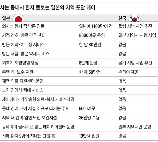 지금까지 환자가 병·의원이나 복지기관을 찾아가는 방식이었다면, 지역 포괄 케어는 방향이 반대다. 의료·복지 서비스가 환자 집으로 가는 체제로 대전환해야 한다. 이에 일본은 의사가 거동이 힘든 환자 집을 방문해 진료하는 이른바 왕진이 활발하다. 일년에 1100만여건 이뤄진다. 의사는 한 달에 두 번 방문 진료하고, 응급 호출에 응한다. 간호사가 환자 집을 찾아가 가정 간호를 하는 방문 간호센터도 전국에 1만305곳을 운영한다. 치과의사와 치위생사가 고령자를 찾아가 구강 관리하는 방문 치과는 한 달에 80만건이 이뤄지고 있다. 방문 재활·약제 서비스가 있고, 영양식을 택배로 보내주거나 정기적으로 찾아가 목욕을 시켜주는 서비스도 활발하다. 우리나라는 이런 제도가 아직 없다. 갑자기 기력이 없고 노쇠해진 노인이 며칠 머무는 단기 입소 생활 개호 기관도 1만1000여개가 있다.