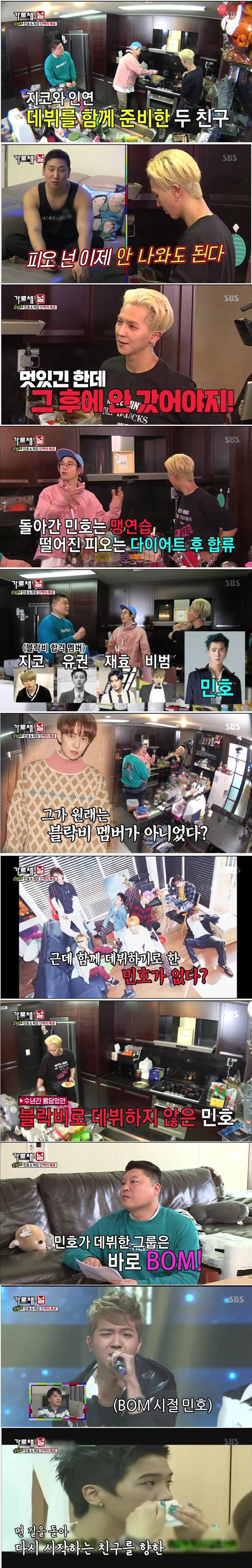 이어 민호는 "BOM으로 데뷔한 날 블락비가 1위를 했다"며 음악방송 대기실에서 피오와 펑펑 울었던 사연을 밝혀 시청자들을 뭉클하게 했다.