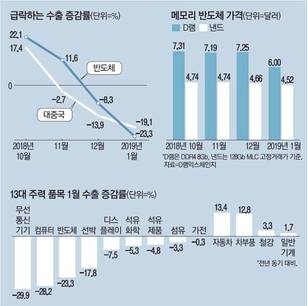 특히 반도체 수출은 날개 없는 추락을 거듭하고 있다. 1월 수출이 1년 전보다 무려 23.3%나 감소한 것은 주력 반도체 제품의 가격 폭락에 따른 것이다. D램 가격은 1년 만에 36.5%나 떨어졌고 낸드플래시도 22.4%나 하락했다. 지난해 역대급 슈퍼사이클로 수출 신기록의 원동력이 됐던 반도체가 올해는 수출쇼크의 주범으로 전락한 것이다.