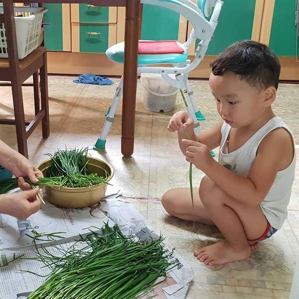 | ▲ 아빠가 전을 부치는 동안 파를 다듬는 아이 |