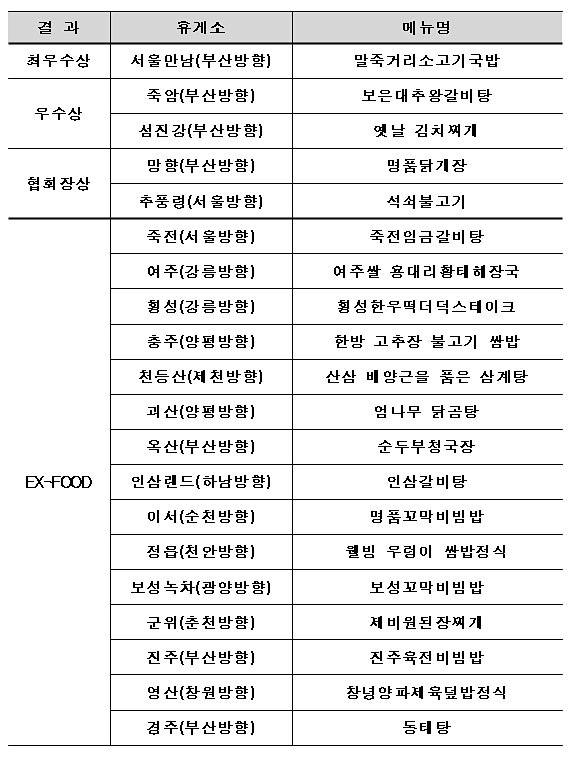 | ▲ 2018년 11월 15일 한국도로공사가 선정, 발표한 EX-FOOD 20품목 |