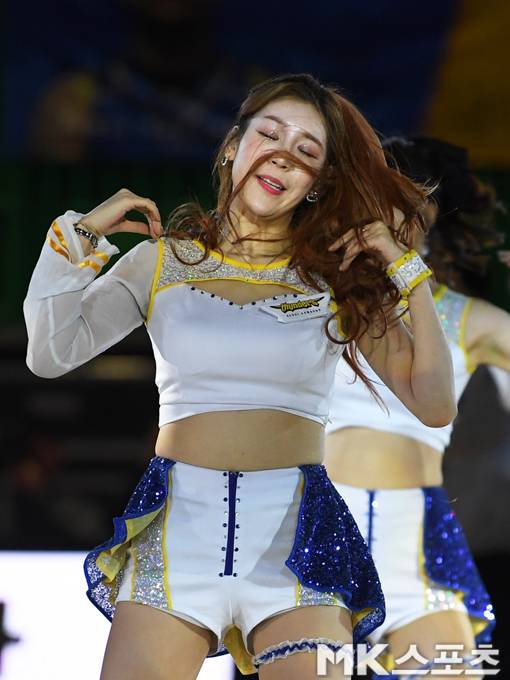 삼성 치어리더가 공연 중 머리카락이 얼굴을 가리고 있다.